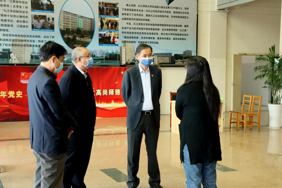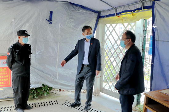 赵伟、陈小林一行还来到大学科技园、校工会、匡庐苑入口等疫情防控工作重点部位实地查看疫情防控工作的落实情况。