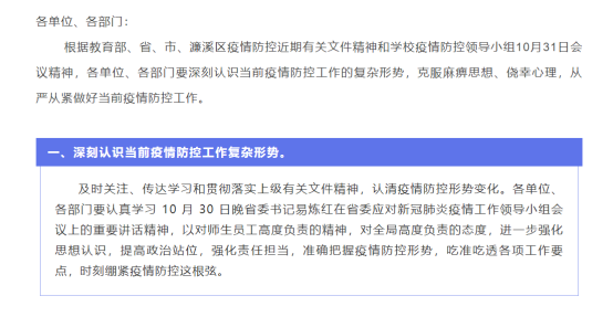 为做好当前疫情防控工作,学校迅速作出反应,多次召开疫情防控专题工作会。10月31日上午,学校召开新冠肺炎疫情防控紧急工作会议,第一时间传达了教育部、省市各级疾控中心发布的疫情防控工作文件精神和通知,并对全校疫情防控工作进行部署。
