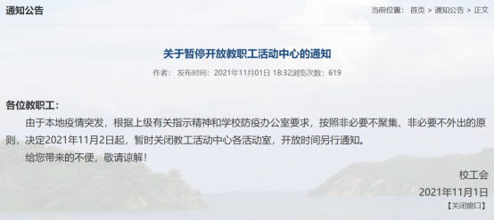 为进一步规范和强化开元疫情防控工作,学校疫情防控工作领导小组办公室、党委宣传部、保卫处、校工会等部门分别发布了《关于做好当前疫情防控工作的提示》《疫情防控的最新提示,请查收!》《疫情防控不可松懈!》《关于加强匡庐苑后门安全管理的通知》《关于暂停开放教职工活动中心的通知》等。