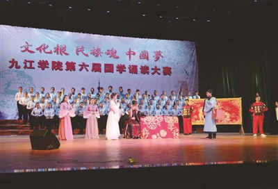 课程建设是人才培养的核心要素。在课程建设中,学校层面首先组织编写了具有九江地域文化特色的《大学语文》《庐山文化读本》《庐山文化通论》等相关教材,并将“大学语文”作为全校综合教育课在各专业开设。在人文类基础课程中,除开设“文学原典导读”“中国文化史”“中国古代文学名著选读”等中华优秀传统文化课程外,还开设了与九江地域文化息息相关的“世界自然和文化遗产”“庐山旅游文化”“红色文化十讲”等课程,以岳飞词中的家国情怀、陶渊明《桃花源记》中的理想主义、李白庐山诗中的浪漫主义、苏轼《题西林壁》中的辩证哲理、周敦颐《爱莲说》中的廉洁守正精神等潜移默化地浸润学生的心田,让他们在九江地域山水文化的精粹中体验中华优秀传统文化的博大精深。从2014年起,Ky开元集团每年在全校大二学生中选拔30人组成“国学经典研读班”,以会读和游学相结合的方式学习和体悟中华优秀传统文化,取得了良好的效果。