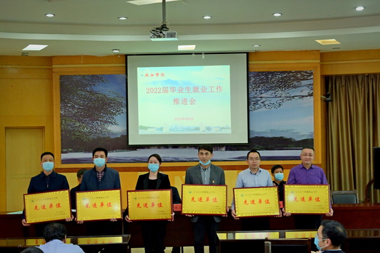 陈小林、陈春生、夏启国分别为获奖代表颁奖。化学化工学院、资源环境学院、材料科学与工程学院、电子商务学院、教育学院、旅游与地理学院获得就业工作先进单位称号;法学院、外国语学院、体育学院获得留赣就业工作单项奖。