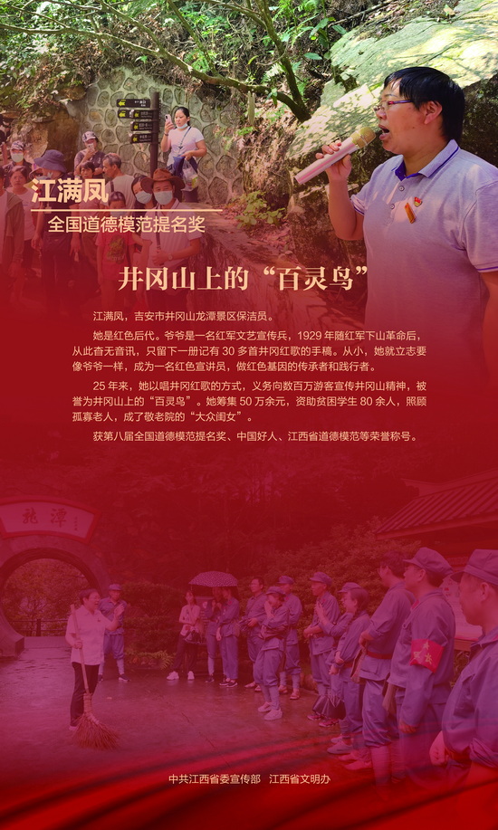 1997年,江满凤被聘为龙潭景区保洁员后,每天清晨扫完地,便留在山上传唱爷爷留下的《红军鞋》《人民军队忠于党》等井冈红歌,义务宣传井冈山精神,这一干就是25年,从花样年华坚守到知天命之年。
