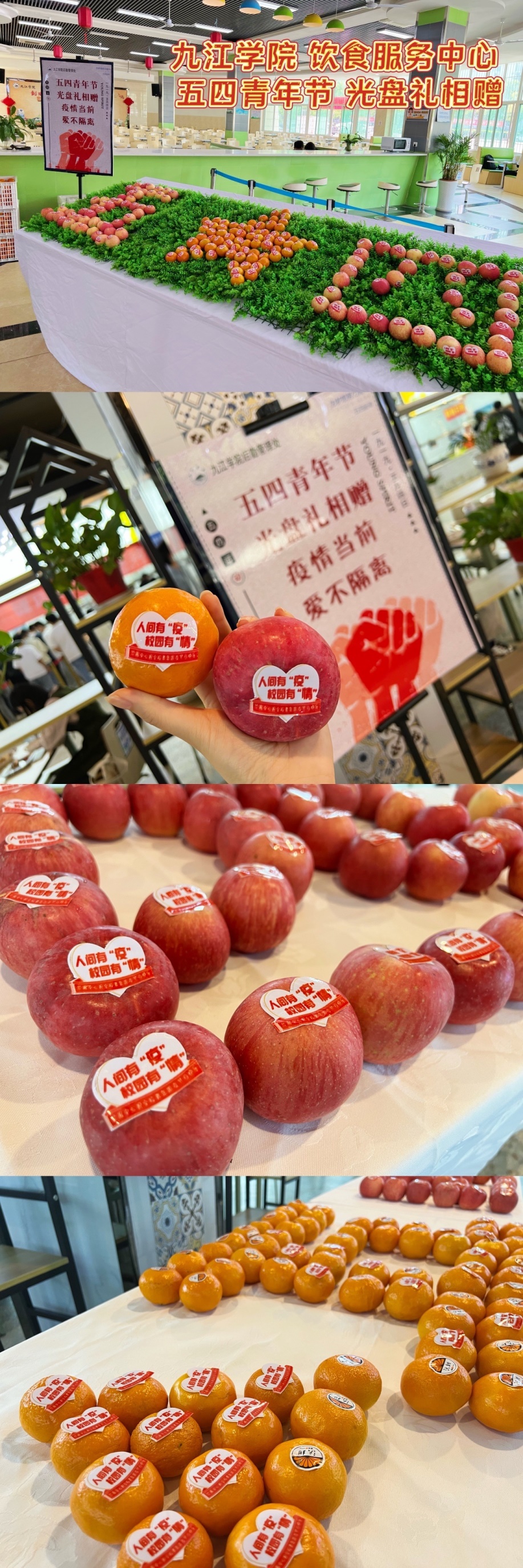 疫情期间,校园管控,师生非必要不外出,后勤管理处通过师生光盘送水果的活动,既倡导和加强了师生们的光盘意识,丰富了假期的校园餐桌,也彰显了九院师生携手同心,共同面对疫情的决心。