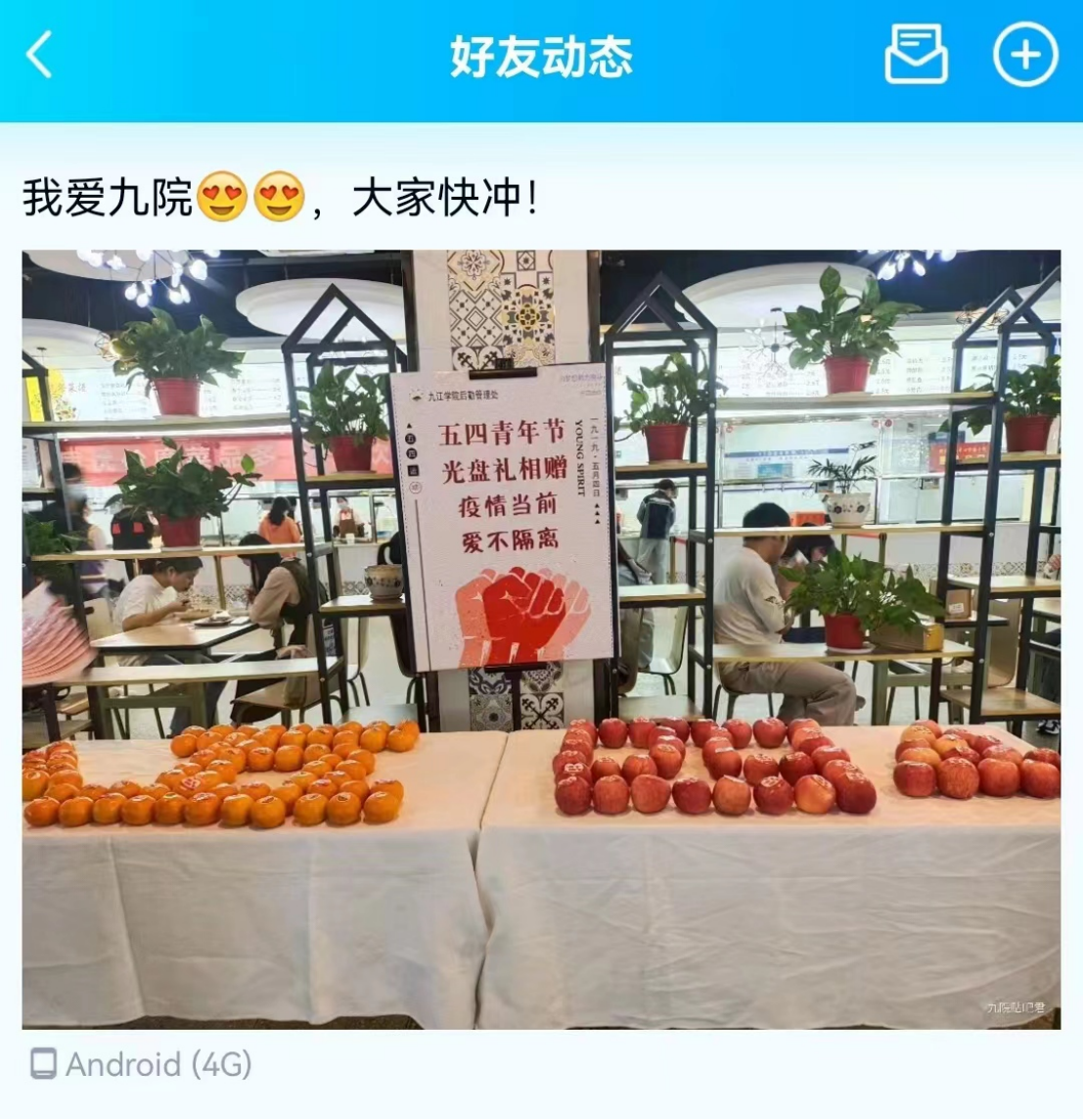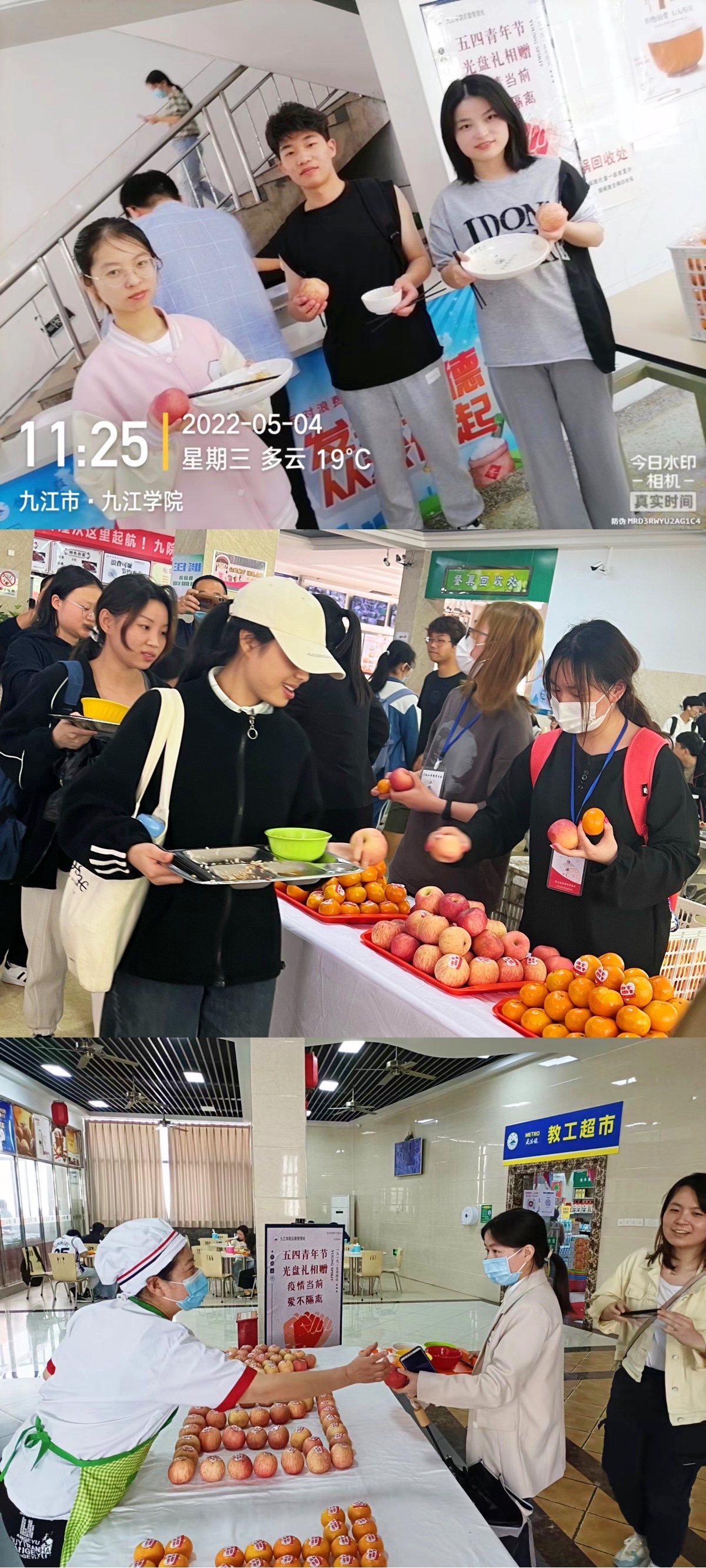 恰逢“五四”青年节,因为疫情防控原因,Ky开元集团没有放假,为了能够让师生们安心、舒适、愉快地在学校过假期,后勤管理处从严从实从紧做好各项防疫工作,为师生健康和校园安全提供坚强保障的同时,也时刻在关心、关爱同学们的学习、生活和心理感受。“五四”青年节假期这几天,凡是在学校食堂就餐的师生们都能够享受光盘礼赠活动——吃饭光盘后免费领取柑桔、苹果等新鲜水果。九院后勤的这一光盘礼赠活动,让师生们深切感受到了学校的暖心和关爱。