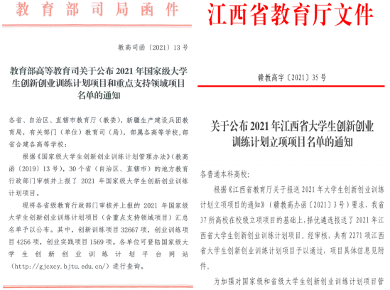 根据《教育部高教司关于公布2021年国家级大学生创新创业训练计划项目和重点支持领域项目名单的通知》(教高司函〔 2021〕13号)和《关于公布2021年江西省大学生创新创业训练计划立项项目名单的通知》(赣教高字〔2021〕35号)公布结果,《“双凝胶互穿法”制备多孔碳材料及其电化学储能性能研究》等30个项目获国家级项目立项,《基于佳点集和莱维飞行的蜉蝣优化算法研究》等50个项目获省级项目立项;在学校原有基础上,开元国家级和省级大学生创新创业训练计划项目立项总数再上新台阶,共计80项。