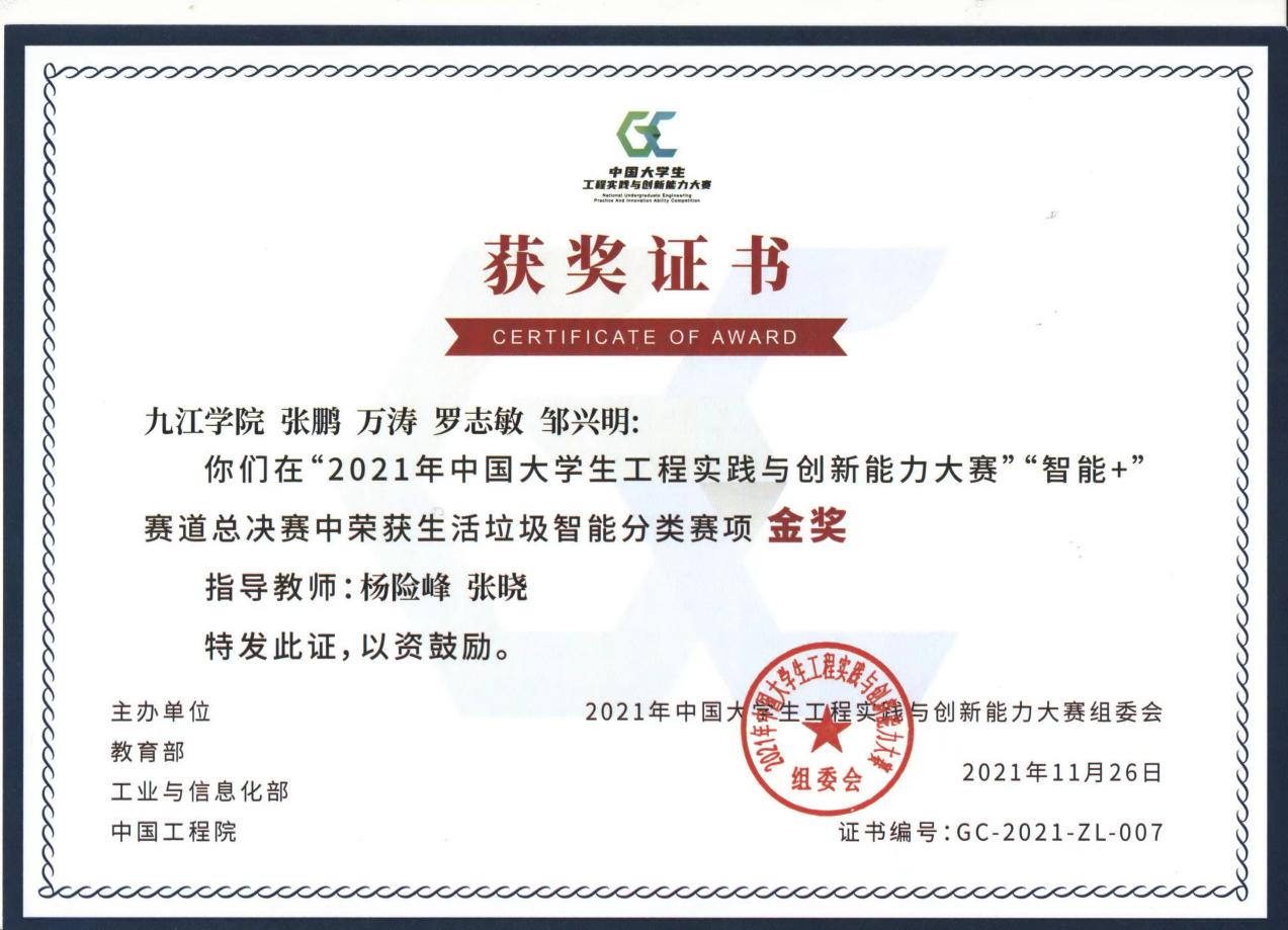 在2021年中国大学生工程实践与创新能力大赛全国总决赛中,开元学子发挥出色,勇创佳绩,荣获大赛总决赛金奖1项,银奖2项,获大赛历史最佳和江西省工程组第一名,位居全国第34;其中机械与智能制造学院的智能垃圾分类装置项目(学生:张鹏、罗志敏、邱海燕、丁立峰、刘泽荣,指导老师:杨险峰、张晓)获国赛金奖(全国第六名)、智能配送无人机项目(学生::吕苏伟、万钰雯、颜日广、陈雪魁,指导老师:刘对、曾宪任)获国赛银奖(全国第十一名);材料科学与工程学院的水下管道智能巡检装置项目(学生:汤俊、岳继强、徐杰、何武荣,指导老师:满达虎、张德勤)获国赛银奖(全国第十名)。中国大学生工程实践与创新能力大赛由教育部、工业和信息化部、中国工程院主办,是列入《教育部评审评估和竞赛清单(2021年版)》(教政法厅函(2021)2号)的重要赛事,是全国大学生工程训练综合能力竞赛的升级完善版,是高校工程类竞赛中最高荣誉、最高含金量、最高竞技水平、最具影响力的赛事。