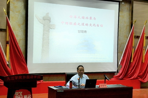 讲座中,甘筱青教授以习近平总书记“五四”重要讲话精神为引言,从近代史上世界大国的特征及其兴衰史、从世界大国成为世界强国的条件和文化要素、中国强国进程中的文化传承及创新、经典诠释新视野与世界不同文明的对话四个角度入手,重点围绕中国共产党百年历史,强调文化自信之于中华民族的重要性。