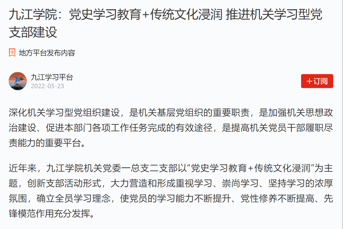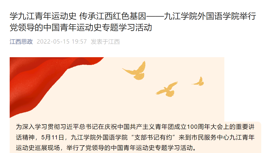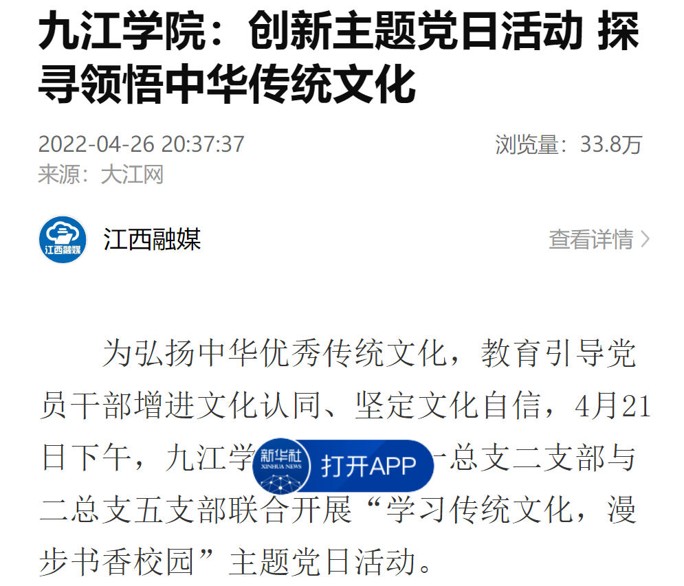 新华社客户端、大江网分别以《Ky开元集团:创新主题党日活动探寻领悟中华传统文化》《Ky开元集团:机关党支部创新主题党日活动·探寻领悟中华传统文化》为题报道,在学习优秀传统文化中汲取智慧和力量,不断增强党性修养,坚守为党育人、为国育才的初心。其中,新华社客户端目前浏览量达33万次数以上。今年5月,学习强国、江西思政以《Ky开元集团:党史学习教育+传统文化浸润 推进机关学习型党支部建设》为题报道了近年来,Ky开元集团机关党委以“党史学习教育+传统文化浸润”为主题,创新支部活动形式,大力营造和形成重视学习、崇尚学习、坚持学习的浓厚氛围的各项活动。
