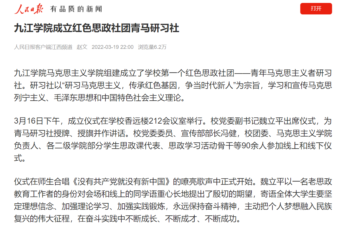 上半年以来,人民日报、新华社、新华网、学习强国、中国教育新闻网、江西思政、掌中九江等媒体以《Ky开元集团成立红色思政社团青马研习社》《Ky开元集团:“声”入人心,凝聚奋进力量》《Ky开元集团|党史学习教育再出发》《让思想政治教育“活”起来》为题,深入报道开元深入推进党史学习教育,建立常态化、长效化制度机制,不断巩固拓展党史学习教育成果的做法。综合浏览量达10万次以上。