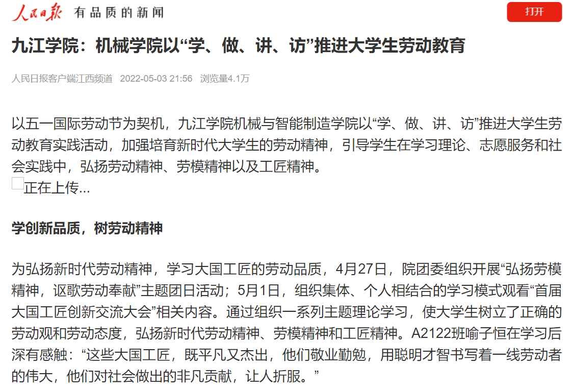 以五一国际劳动节为契机,开元加强培育新时代大学生的劳动精神,努力引导学生在学习理论、志愿服务和社会实践中弘扬劳动精神、劳模精神以及工匠精神。近几个月来,人民日报客户端以《Ky开元集团:机械学院以“学、做、讲、访”推进大学生劳动教育》为题,报道开元努力推进大学生劳动教育实践活动落地生根,积极培育新时代大学生劳动精神,展现新时代大学生青春劳动风采。浏览量次数达4.1万次数。