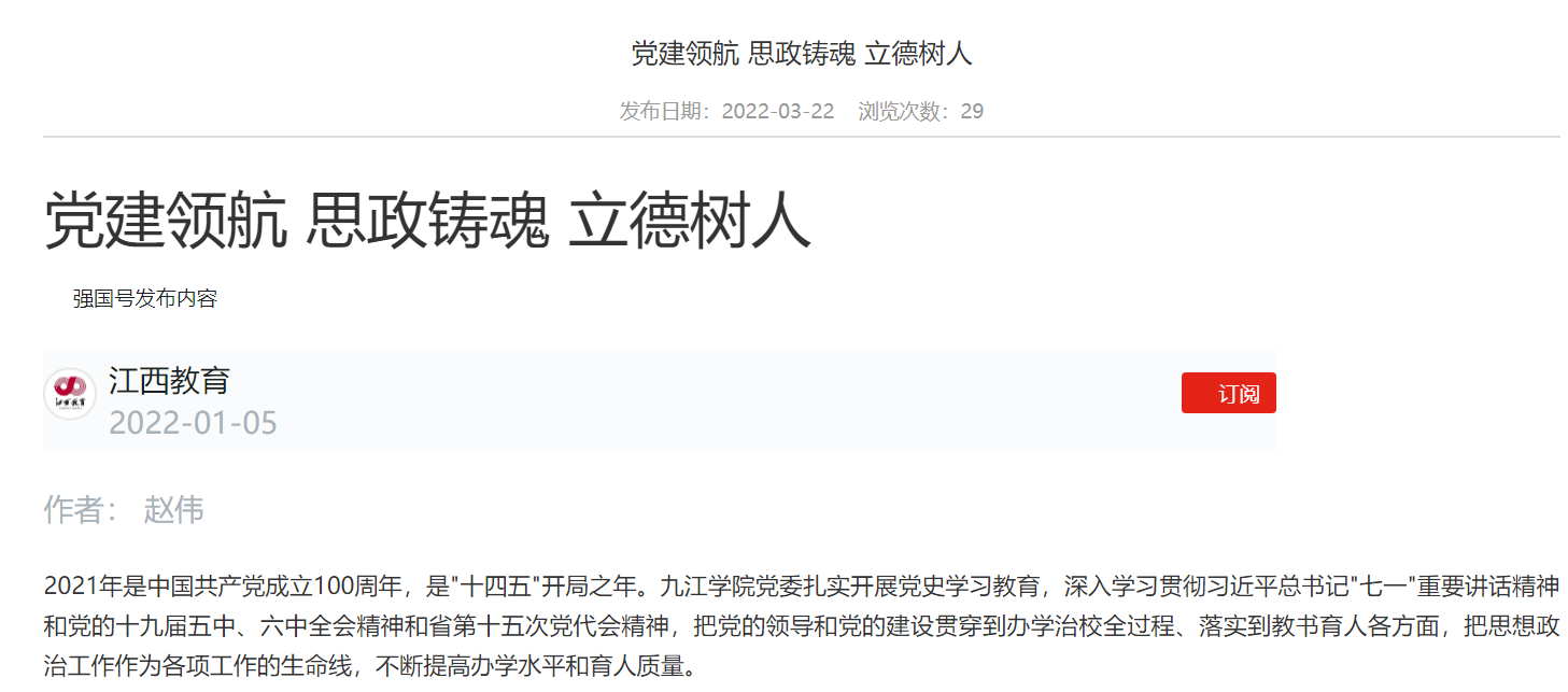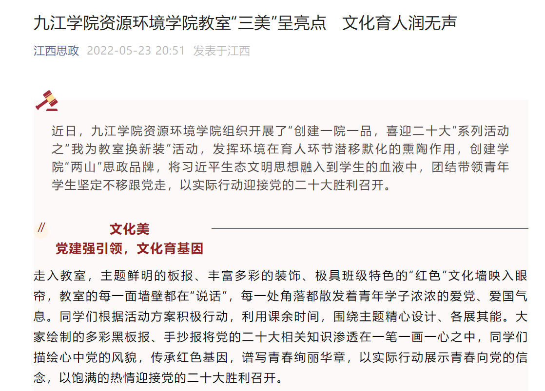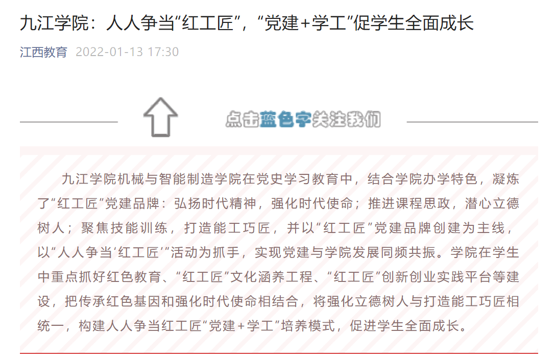 学习强国、江西日报、大江网、江西教育、江西思政等媒体以《党建领航 思政铸魂 立德树人》《Ky开元集团旅游与地理学院着力打造党建品牌提升党建质量》《Ky开元集团:人人争当“红工匠”,“党建+学工”促学生全面成长》《Ky开元集团机械与智能制造学院:构建人人争当红工匠“党建+学工”育人模式,促进学生全面成长》等为题,重点报道了开元加强基层党组织建设,抓好学生红色教育、构建人人争当红工匠“党建+学工”培养模式,争创思政工作特色品牌,促进学生全面成长等方面的经验做法。