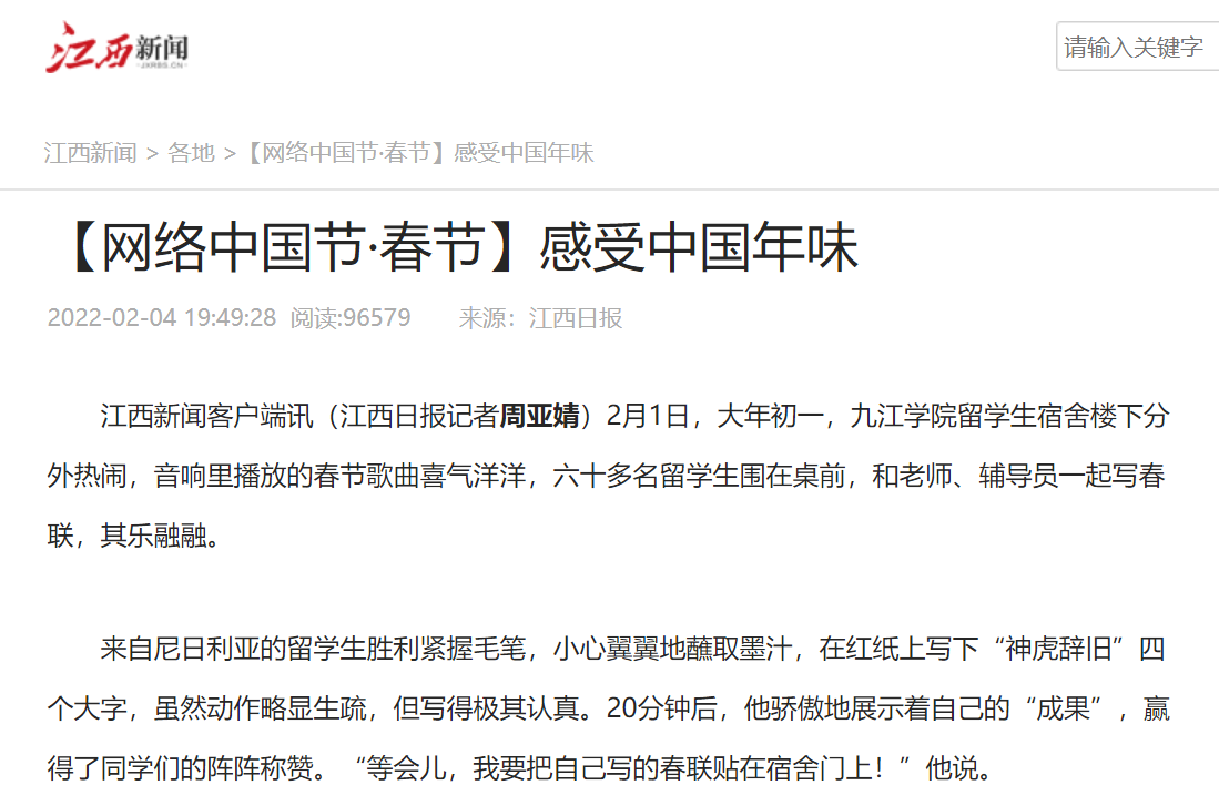 春节期间,江西思政、江西新闻、江西日报分别以《Ky开元集团柬埔寨皇家科学院孔子学院举办系列春节文化交流活动》《网络中国节·春节:感受中国年味》为题,弘扬中华优秀传统文化,浏览量达上万次数。