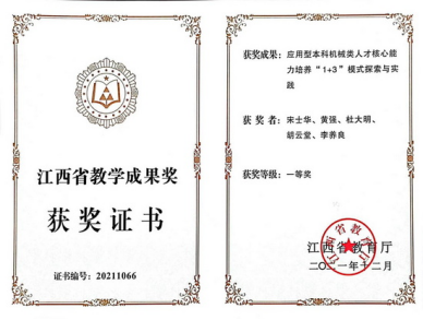 学院积极申报国家级、省级一流课程和教学改革等项目。2021年《机械制图》已通过江西省一流本科课程认定,《材料科学基础Ⅱ》等3门课程荣获校级一流本科课程建设立项,材料成型专业教学团队获批江西省高水平本科教学团队建设立项,教学改革研究项目成绩斐然,荣获江西省教学改革重点课题1项,一般课题1项,由我院教师杜大明、李养良参与的《应用型本科机械类人才核心能力培养“1+3”模式探索与实践》荣获江西省教学成果一等奖。
