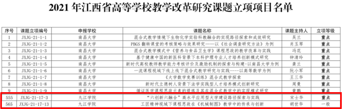学院注重教学成果培育,积极组织教师开展教育教学改革,积极凝练改革成果并组织申报教学成果奖。2021年学院获第十七批江西省教学成果奖2项,其中《应用型本科机械类人才核心能力培养“1+3”模式探索与实践》获一等奖,《“递进式、多元协同、四轮驱动”机械创新创业人才培养体系的构建与实践》获二等奖。