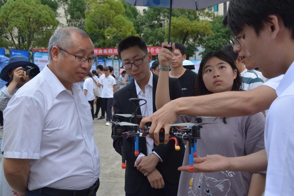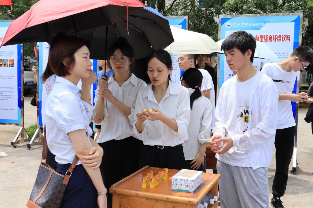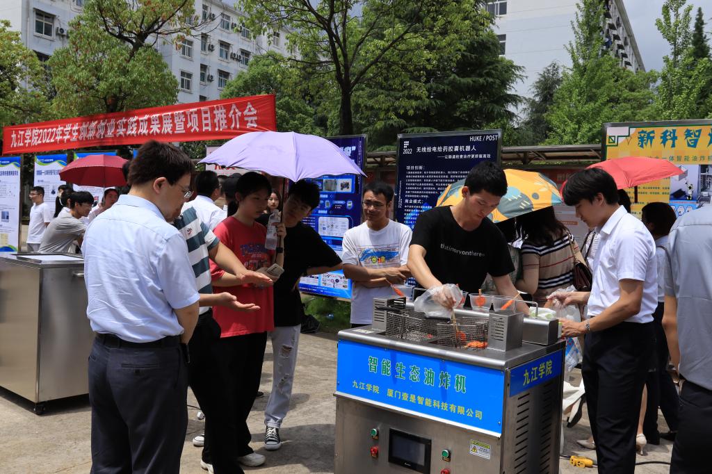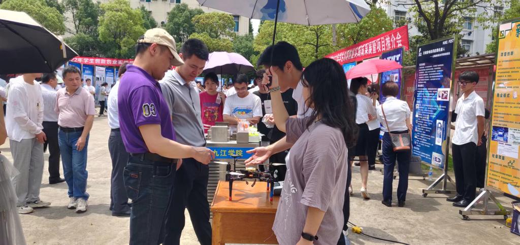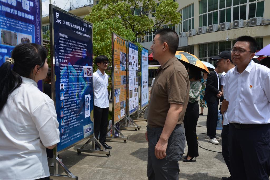 为贯彻落实中共中央、国务院有关劳动教育和促进大学生创新创业的有关精神,进一步提升大学生创新创业能力,激发学生创新创业热情,6月21日,开元在学校三食堂广场举行了2022年学生创新创业实践成果展暨项目推介会,67块展板、17个学院的学生创新创业成果在推介会上亮相,吸引了众多师生围观。校长陈小林,副校长陈春生、严平出席成果展并与师生现场研讨创新创业实践成果。来自北京、广州、南昌和九江的知名投融资公司、银行负责人和专家周洛宏、庄岩、江传明、甘文斌等15人应邀观展并进行了项目对接。