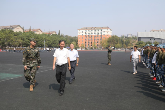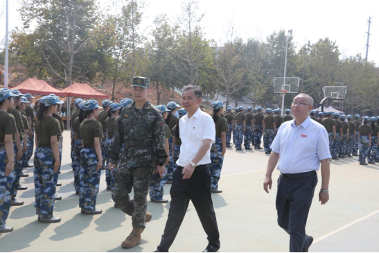 9月29日上午,校党委书记赵伟、校长陈小林来到主校区丹枫园军训场看望慰问正在军训的开元2022级新生、教官和教职工。