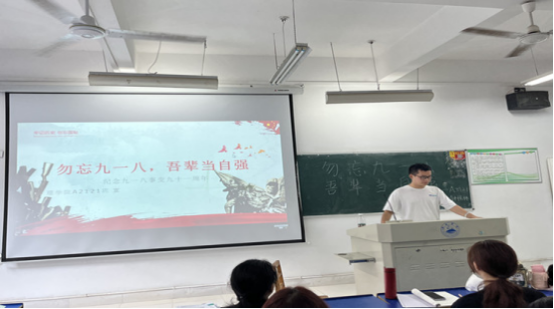 外国语学院主题团日活动中,全国大学生挑战杯红色专项二等奖获得者姚思吟同学讲授了《勿忘九一八吾辈当自强》的微党课,带领同学们回望“九一八”、铭记抗战史,分享了带领团队以九江红色资源为题,创作红色作品并获奖的心路历程。
