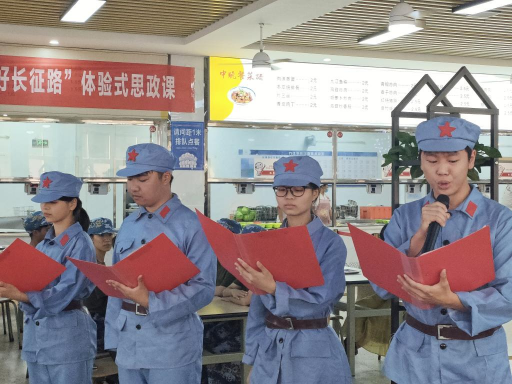 在新生军训期间,外国语学院组织2022级军训新生共上一堂“体验红军餐,走好长征路”军训思政课。思政课堂通过唱红色歌曲、诵长征组诗、讲战斗故事、体验红军餐等环节,激励新生们走好新时代长征路。