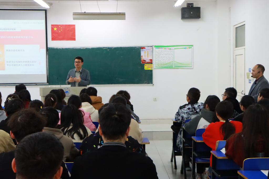 3月30日下午,学校邀请2010届校友、江西同荣节能科技有限公司总经理王军波来校,与马克思主义学院段善君博士一起,采取“双师同堂”授课模式,为理学院A2111、A2112班学生讲授了《习近平新时代中国特色社会主义思想概论》课程第六专题“以新发展理念引领高质量发展”中的部分内容。段善君博士讲述了两个毫不动摇之一的毫不动摇巩固和发展公有制经济;王军波总经理结合自身创业历程,讲述了国家如何毫不动摇鼓励、支持、引导非公有制经济发展,促进非公有制经济健康发展和非公有制经济人士健康成长,然后给学生创业就业几点建议。