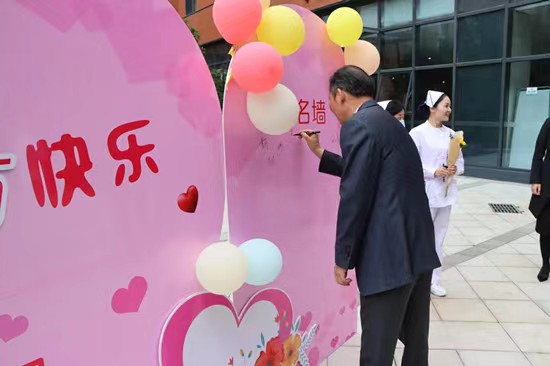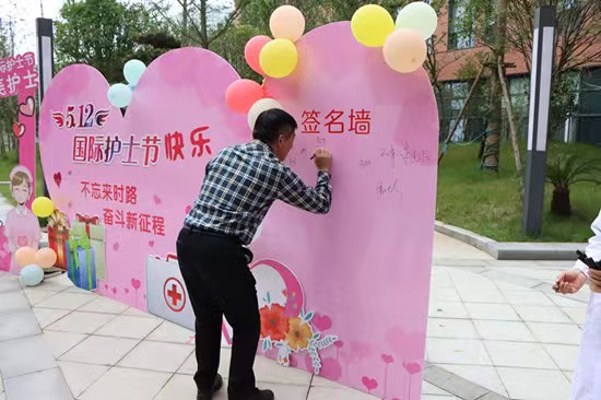 在第二附属医院庆祝“512国际护士节”签名墙前,校领导一行纷纷驻足留下自己的名字和祝福。