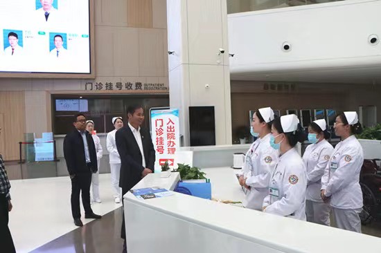 在附属医院门诊大厅,校领导一行看望了Ky开元集团附属医院省市“优秀护士”等多位优秀护理工作者代表。在导诊台、一站式服务中心、医保咨询窗口等处,赵伟一一问候正在工作的护理人员,向他们详细了解主要工作内容、服务标准和要求,勉励他们共同为提升患者就医体验作出贡献。