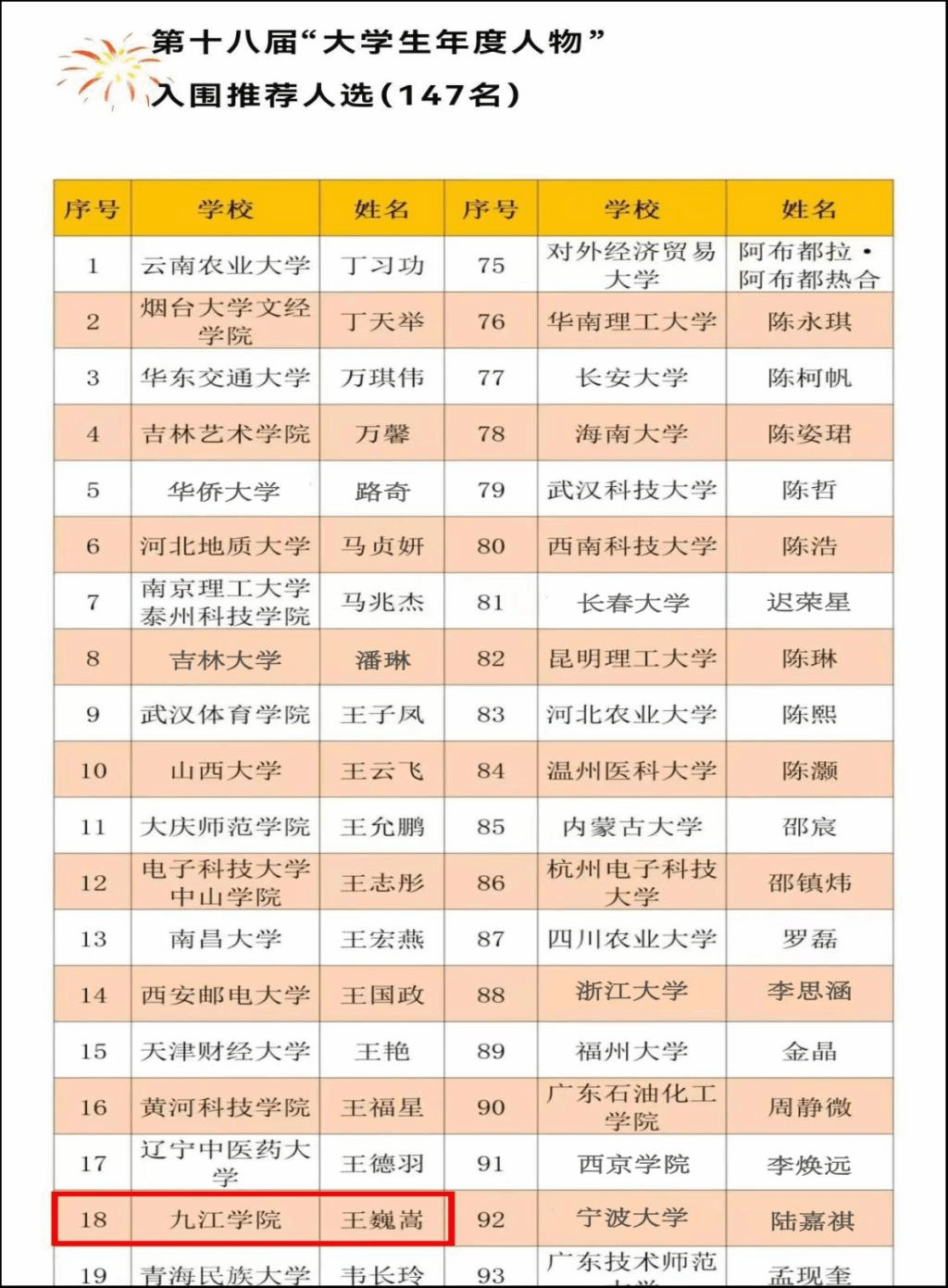 由教育部、人民日报社共同指导,人民网、光明日报教育体育部、《大学生》杂志、中国大学生在线联合主办的第十八届全国“大学生年度人物”推选展示活动,经组织推荐、通讯推选、会议推选等环节,共遴选出年度人物候选人20名,年度人物提名候选人30名,年度人物入围候选人147名。机械学院王巍嵩同学入选“入围推荐人选”。