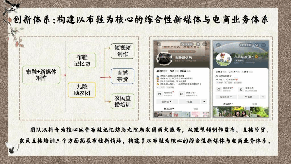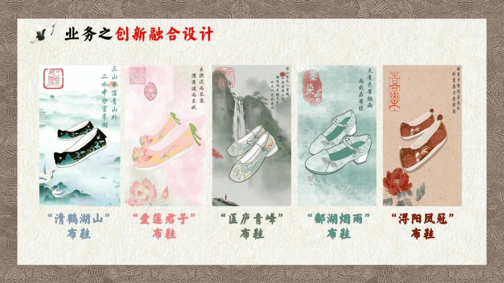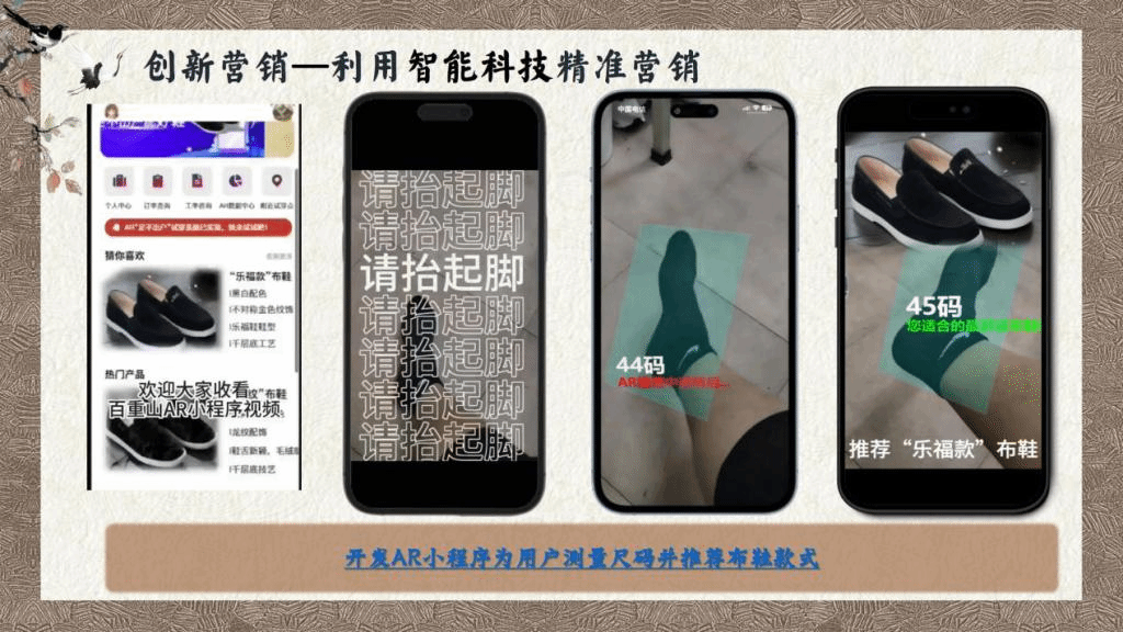 开元代表队把消费者定位为深受注重悦己消费、民族认同感高的85后至00后,将布鞋与他们所喜爱的智能科技、国潮设计相结合,设计了“百重山”,一个集原创设计、直播培训、科技引流、新媒体营销、农民就业全覆盖的新型农业产业链逐步形成。为解决布鞋款式单一的难题,团队依托江西大江大湖、名山名人的特点,融入庐山,鄱阳湖,爱莲说等元素,设计出“浔阳凤冠”“匡庐青峰”“鄱湖烟雨”“爱莲君子”“青鹤湖山”等多款布鞋。同时,团队创新设计出“百重山智慧商城”“AR试鞋小程序”等吸引国潮爱好者的软件,利用智能科技实现了精准营销。
