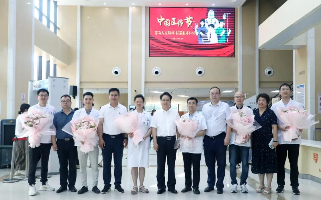 李明斌代表学校党政向附属医院长期以来在医疗战线上辛勤付出、做出贡献的全体医务人员,致以节日的问候和衷心的感谢。他指出,附属医院作为江西第一所西医医院、作为我市老牌的三甲综合医院,为九江市医疗卫生事业作出了突出贡献。希望大家牢记光荣传统和使命,继续发扬救死扶伤的精神,不断提升自己的医德修养和医疗水平,不仅要成为医疗技术先进的代表,也要在医学科研和医学教育上不断突破,更要在关爱生命、服务社会的实际行动中做出更多贡献,切实增强作为一名医务人员的职业荣誉感和归属感。
