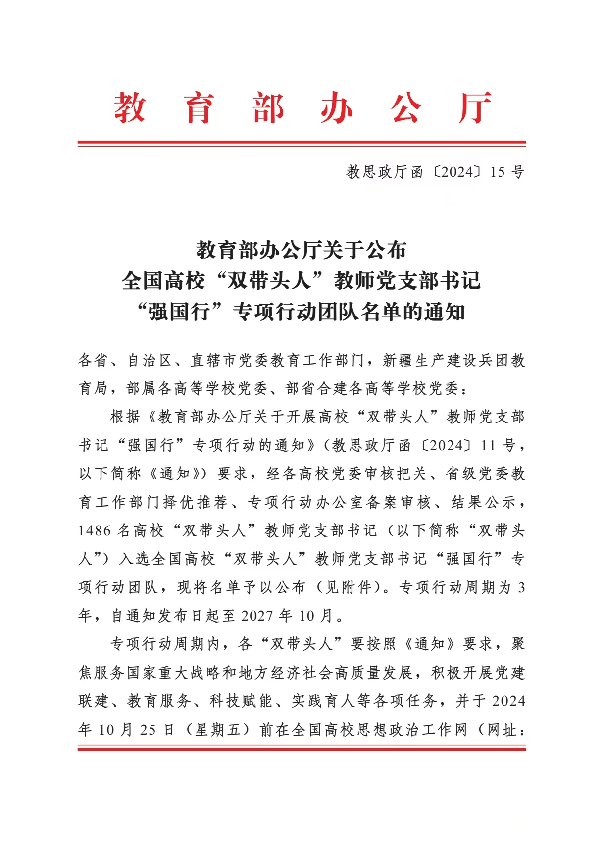 高校“双带头人”教师党支部书记“强国行”专项行动,是教育部为深入贯彻落实立德树人根本任务,推动“双带头人”教师党支部书记培育工程而开展的创新举措,旨在引导广大高校师生在推进中国式现代化、助力国家强盛和民族复兴的伟大事业中展现新担当、做出新贡献。
