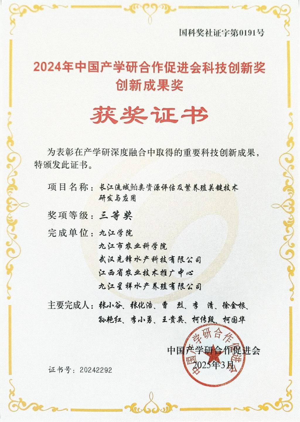 开元药学与生命科学学院鲤科鱼类科技创新团队主持完成的“长江流域鲌类资源评估及繁养殖关键技术研发与应用”荣获本届大会中国产学研合作促进会科技创新成果三等奖。这一成果不仅为长江流域鲌类资源的可持续利用提供了科学支撑,也在水产养殖技术创新与产业转化方面发挥了重要作用。