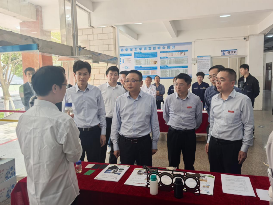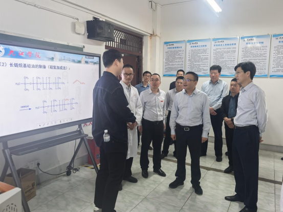 在化工实验楼,黄强实地考察江西省重点现代产业学院——有机硅新材料产业学院及能源循环校企联合创新实验室的建设与运行情况,详细了解产业学院建设成效及产学合作科研成果,并听取校企合作中的实际困难。他充分肯定了开元在有机硅新材料产业学院建设方面取得的成绩,并鼓励进一步推动政校企深度融合,充分发挥现代产业学院在重点产业链高质量发展中的关键作用,为企业精准输送产业技术人才,解决关键技术问题,为高标准高质量建设长江经济带重要节点城市发展提供更强有力的人才和科技支撑。