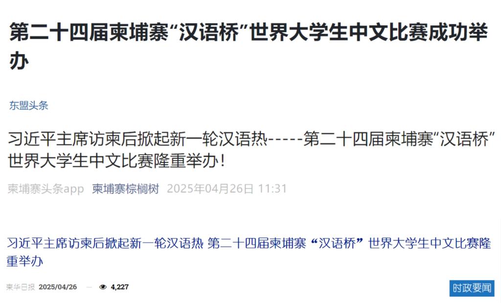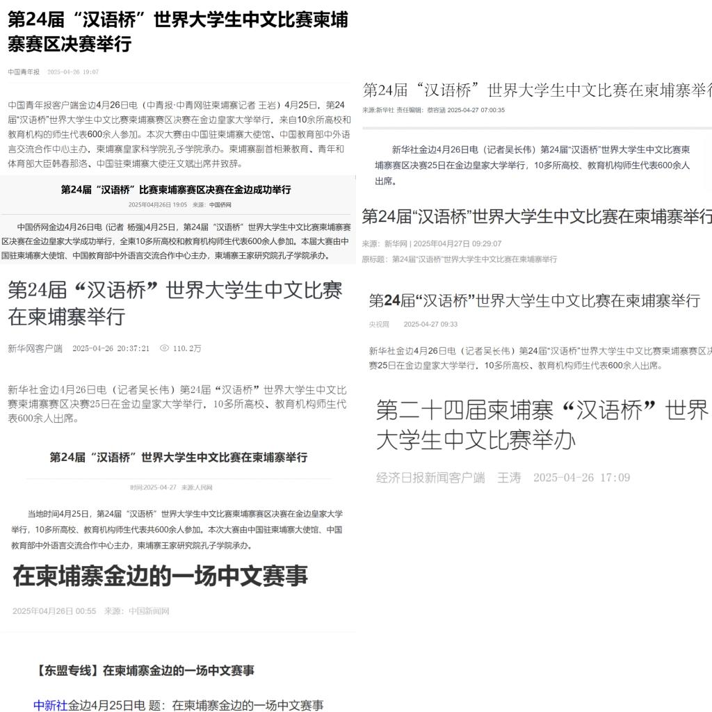 赛后,中柬两国主流媒体形成联动效应展开集中报道。新华社、人民网、中国新闻网、中国青年报、中国经济日报等权威媒体以专题形式详细报道了赛事亮点,突出展示了开元孔子学院的核心作用;柬埔寨柬华日报、东盟头条、柬埔寨头条等本地媒体则聚焦比赛对本国中文教育水平提升的积极推动,称其为“青年语言能力与文化热情的重要展示平台”。各媒体的大力宣传,吸引了广大中柬人民的关注,其中新华网关于汉语桥的报道点击量超120万次,进一步提升了开元孔子学院在中柬人文交流中的影响力。