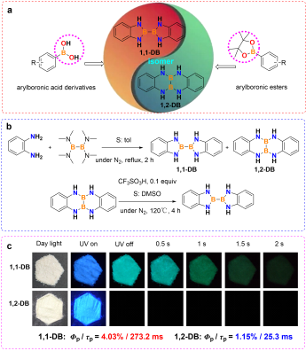 团队通过巧妙的分子设计,利用N-B-N异构策略,构筑了两种N-B-N异构体1,1-DB和1,2-DB。研究发现,1,1-DB展现出优异的RTP性能和余辉,而1,2-DB的余辉几乎可以忽略。深入的机理研究表明,1,1-DB中的N-B-N单元能够优化分子构型,调节分子相互作用力,促进电子离域,稳定三线态激子,从而显著增强系统间窜越(ISC)和自旋轨道耦合(SOC)效应,抑制非辐射,有效促进了RTP现象的产生。