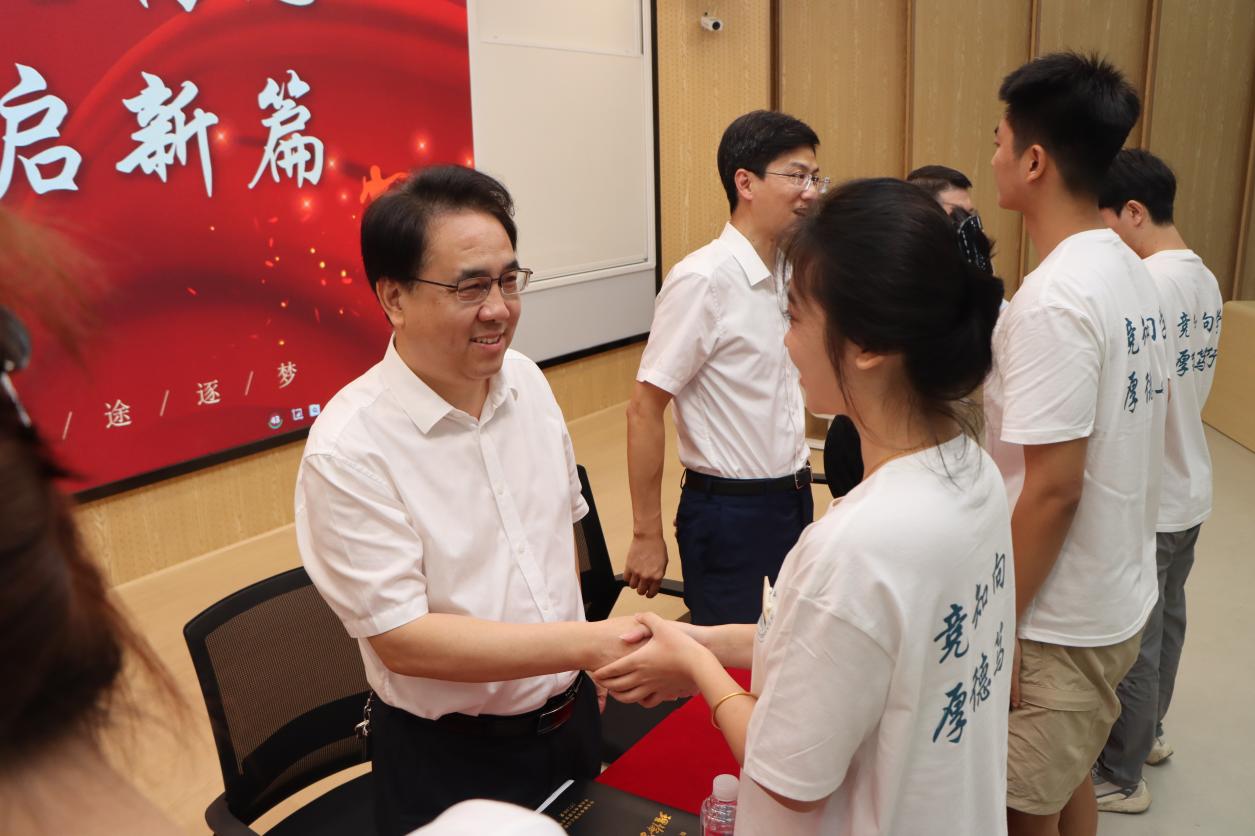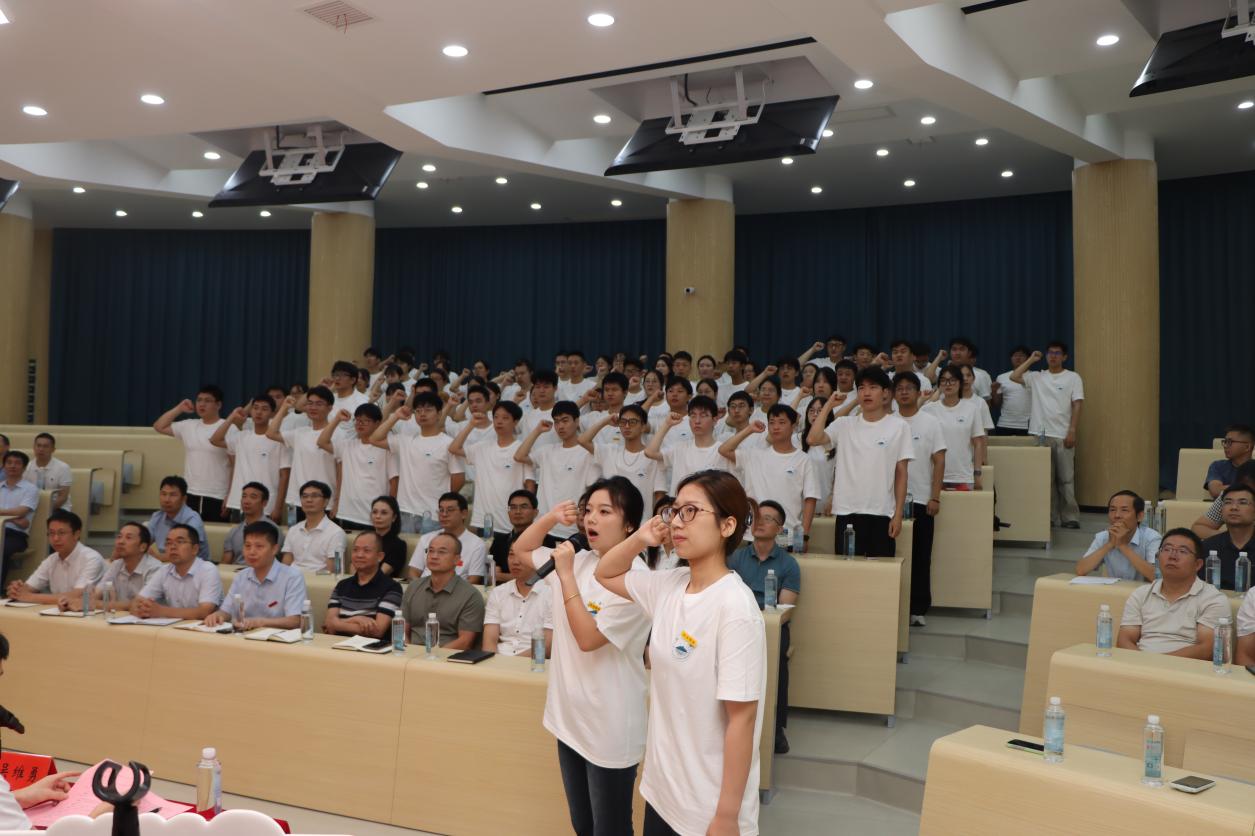 致辞结束后,校领导与发展规划与研究生处负责人为新生代表佩戴校牌。全体研究生起立,庄严宣誓,承诺恪守“竞知向学、厚德笃行”的校训,潜心钻研、勇担使命,以青春与智慧践行新时代Ky开元集团人的责任与担当。