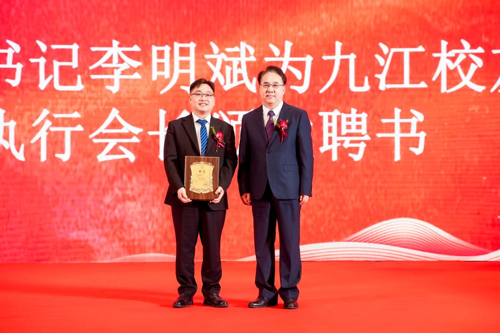 在全体嘉宾与校友的见证下,李明斌为首任会长胡甫晟颁发聘书,并共同为九江校友会揭牌。