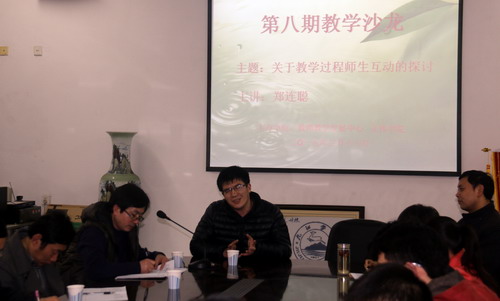 郑连聪老师主讲过多门专业课程,具有丰富的教学经验,对于教学中的师生互动认识,他结合自己的教学案例,阐述了自己的观点与做法。他认为教学工作既是一门技术,同时又是一门艺术,教学互动不仅具有技巧性,同时也是教育理念的体现,师生间的交流互动不是简单的一问一答,而应该是双向的,贯彻于整个课堂并在进行中不断调整的;教师对教学艺术的追求应是不断探索、不断寻找的,既要发现自己的不足也要善于发现学生的优点,认识到学生的可能性,高层次的师生互动是师生之间教与学的互为补充,教学相长,从而双方达到全方位的提高;一个好的老师,其教学不是简单的“传授、灌输、给予”,而是“唤醒、点燃、分享”,即唤醒学生心中本来就有的一些东西,点燃他们学习的可能性,让师生通过交流相互分享心得,共同进步。最后郑老师向在座老师推荐了《上学记》、《桑榆忆往》二本书籍,并提出了自己在教学过程中遇到的困惑,希望能够与大家商讨。