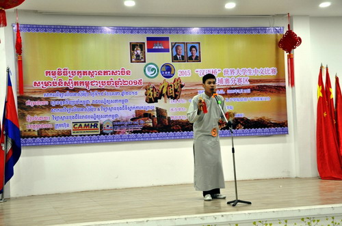 经过激烈的角逐,来自亚欧大学的江柏利用流利的汉语作的深情演讲、精彩的单口相声征服了评委获得了的冠军,他将代表柬埔寨参加于今年7月在长沙举行的“汉语桥”总决赛。 此次比赛二等奖的选手还将去中国观摩比赛,此奖项意旨在帮助更多的柬埔寨学生了解认识中国,鼓励更多的柬埔寨学生学习汉语。