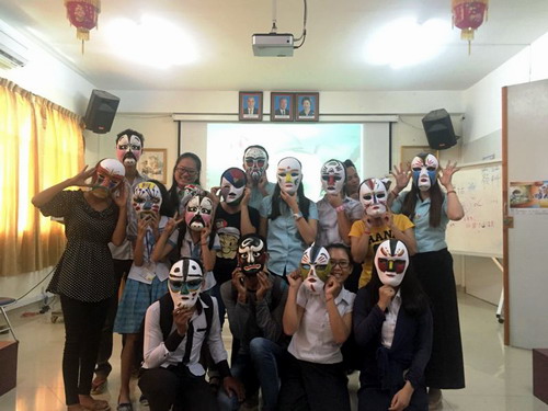 在正式讲解前,周亚莉老师给学生播放了一个关于中国水墨画的视频,让学生很直观地欣赏到中国国画的魅力,抓住了学生们的心。然后,周老师从颜料入手,带着学生一起调色,让学生们从活动开始就参与其中。接着,借助PPT切入主题,从国画的定义、使用材料、发展历程、国画的分类、国画大家等方面依次进行讲解,让学生进一步了解中国国画。在讲解完PPT之后,周老师让学生上台,画具有中国特色的京剧脸谱。学生们非常积极,争着上台画脸谱,掀起了本次活动的高潮。大家都充分发挥了自己的想象力,自由搭配各种颜色,画出了自己心目中的京剧脸谱。最后,学生们戴着自己动手画的脸谱,和老师一起合影留念。