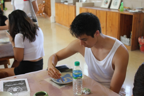 陶艺体验当然也是学习陶瓷文化必不可少的环节。27日,大家来到陶瓷体验区,在观看陶瓷大师制瓷时,营员们都纷纷表示道:“这是一个简单的活,只是捏一捏,拉一拉就行了”。但是当来到体验区,大家坐到坯土面前都显得手足无措。营员们分成两组,认真听老师讲解的同时,自己也开始动手做,毕竟是第一次,大家都略显生疏,有些营员还会把泥土溅出来,可是时间久了,部分同学掌握了诀窍,在老师的帮助下,做出来的碗盘、碟子等等,还有模有样。但是也有些同学做的样子不太好看,略有失望同时也不舍不弃。营员们还进行了捏土、画坯的体验,有些同学捏出了很多卡通人物和动物,有些同学在盘子上画出各种各样的花型和玩偶。在短暂的时间里,大家积极参与,最后离开时,还带着恋恋不舍的心情,表示下次有机会过来,还要体验一把。