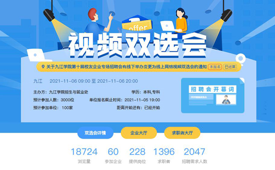 本次招聘会共有来自上海、广州、深圳、义乌、宁波、东莞、杭州、中山、南昌、九江等地的校友企业60家,招聘岗位228个,招聘人数2407名,涉及开元21个二级学院的相关专业。据统计,在此次线上招聘会中,开元2022届毕业生有效点击浏览18724人次,有效简历投递1413人,视频面试279人,最终达成就业意向的毕业生403人。