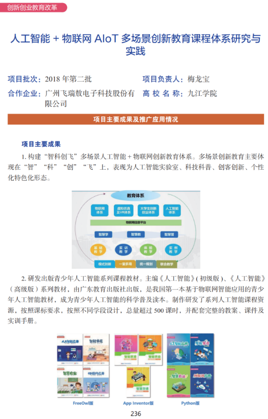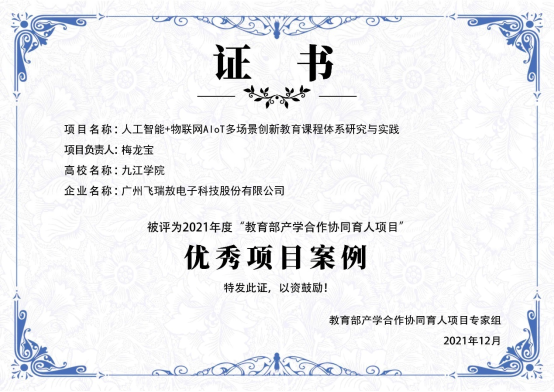 经学校评选推荐和专家组严格评审,开元梅龙宝教授与广州飞瑞敖电子科技股份有限公司深度合作的《人工智能+物联网AIoT多场景创新教育课程体系研究与实践》取得了丰硕的协同育人成果,成功入选2021年度教育部产学合作协同育人项目优秀项目案例。