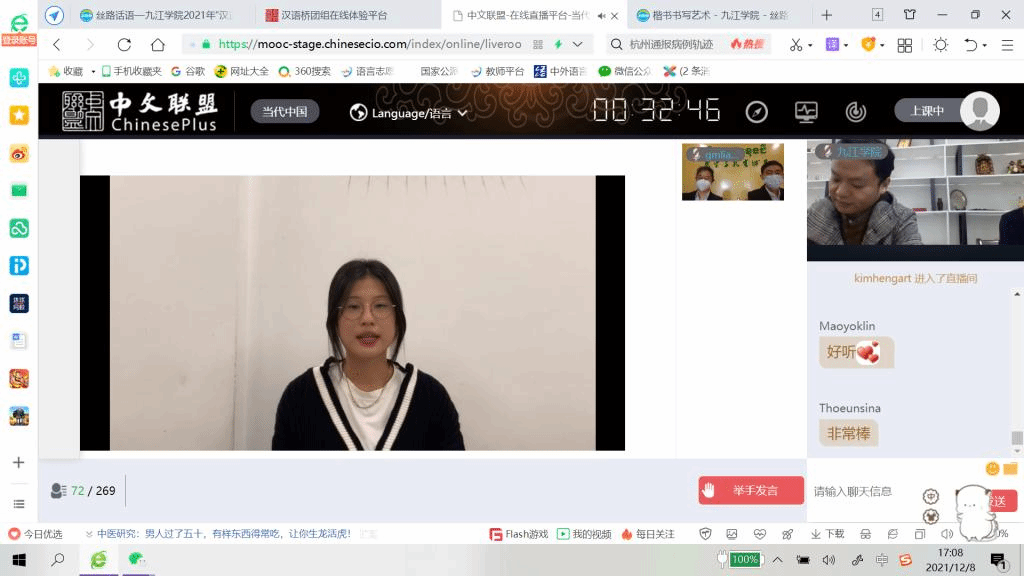 亚欧大学中文系程宝佳同学、暹粒吴哥高中孔子课堂林丽香同学作为学员代表分享了学习心得。他们表示,虽然冬令营活动只有九天的时间,但在老师们的悉心教导下,大家已学习到很多新知识,也体验到丰富多彩的中国传统文化。