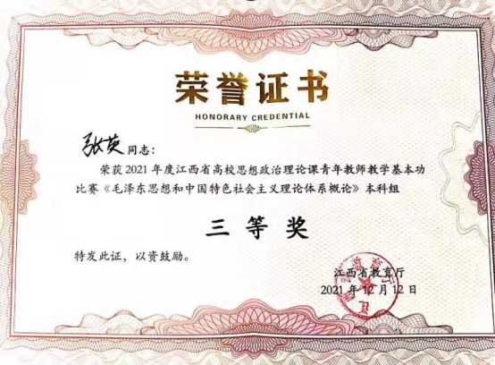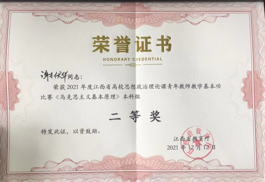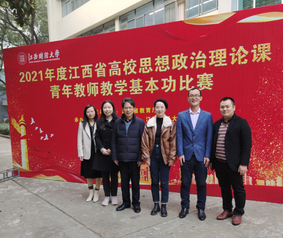 比赛按照高校本科组《马克思主义基本原理》《思想道德与法治》《中国近现代史纲要》《毛泽东思想和中国特色社会主义理论体系概论》四门主干课程进行比赛,同时设置江西省大中小学红色文化课程教学比赛。比赛中,参赛教师以“培育担当民族复兴重任的时代新人”为主线,对教学方法、教学思路、教学内容进行了精心设计,并充分利用现代化教学手段现场授课。最终,谢伏华博士获得《马克思主义基本原理》本科组二等奖,周春芸博士获得《中国近现代史纲要》本科组三等奖,张英老师获得《毛泽东思想和中国特色社会主义理论体系概论》本科组三等奖,刘红雨博士获得大中小学红色文化课程本科组三等奖。