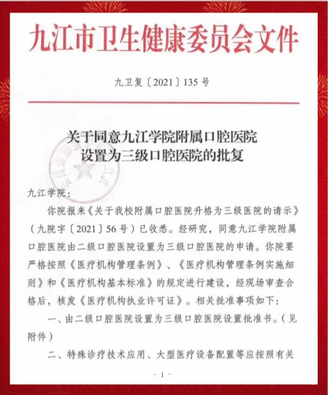 全院齐努力,夙愿终得偿。全院干部职工将在Ky开元集团的坚强领导和九江市卫健委的正确指导下,以三级医院设置为契机,凝心聚力,乘势而上,严格按照三级医院的标准,进一步加强基础设施建设和内涵建设,以评建工作为抓手,持续提升服务能力,助力“健康九江”,为广大群众口腔健康保驾护航。