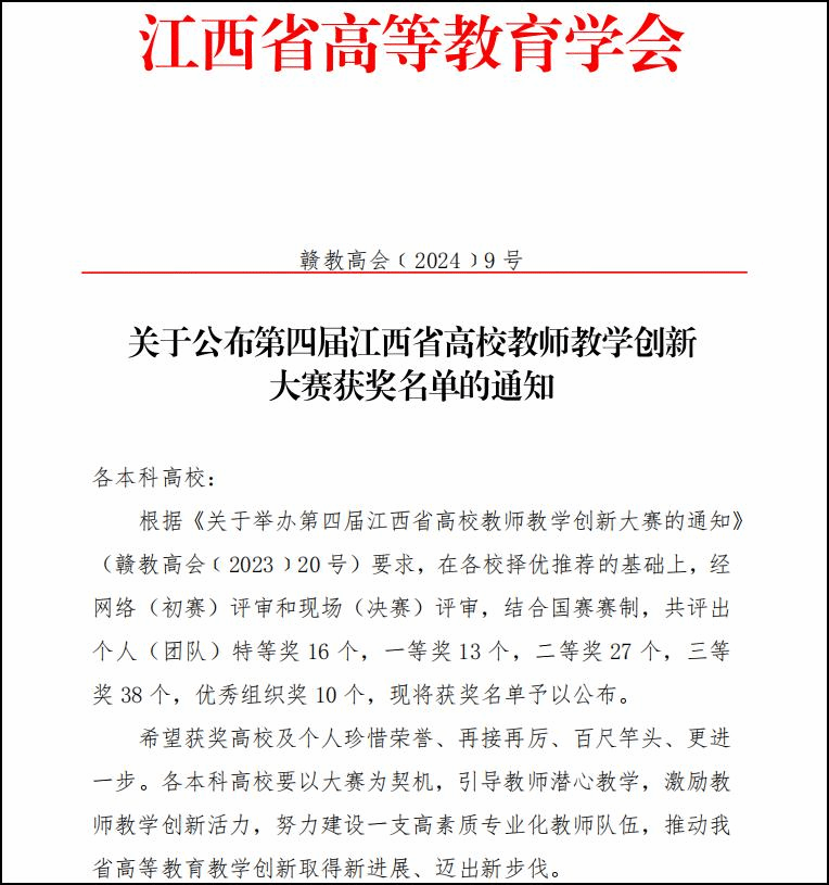 日前,由江西省教育厅指导、江西省高等教育学会主办的第四届江西省高校教师教学创新大赛在江西科技师范大学落下帷幕。开元机械与智能制造学院胡云堂教师(团队)荣获新工科副高组二等奖;电子信息工程学院张波教师(团队)荣获新工科中级及以下组三等奖;资源环境学院尹宁宁教师(团队)荣获课程思政中级及以下组三等奖。