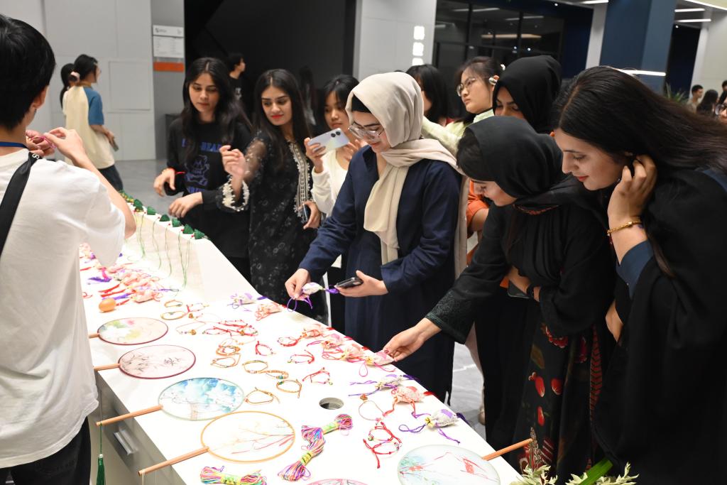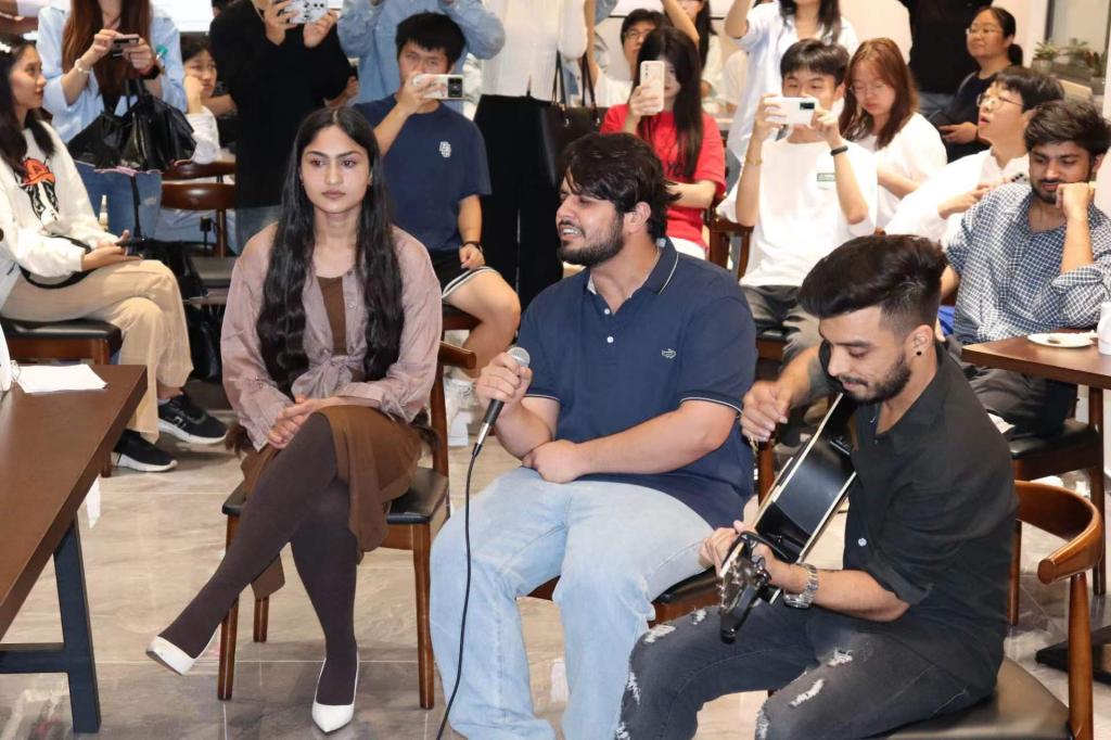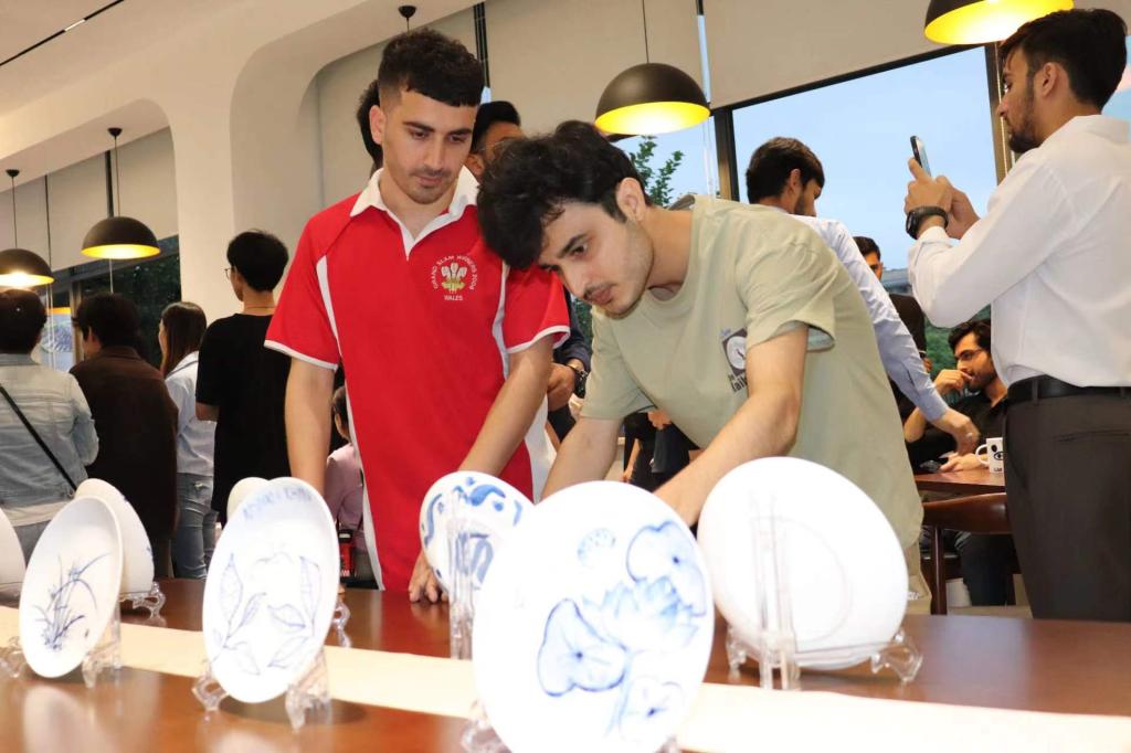 中外师生一边聆听着巴基斯坦籍留学生Aashan与Muhammad令人陶醉的吉他弹唱,一边参观了留学生自制的陶瓷艺术品。