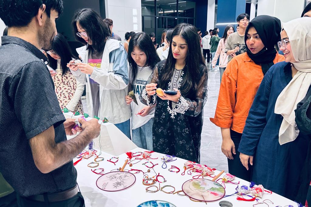 活动现场还设置了多个互动环节,中外师生们共同学习制作香囊和五彩手环。在大家的巧手下,一个个精美的香囊和手环应运而生,香气四溢、色彩斑斓。此外,学院还为师生们准备了美味的粽子,让大家在品尝美食的同时感受中国传统节日的氛围。