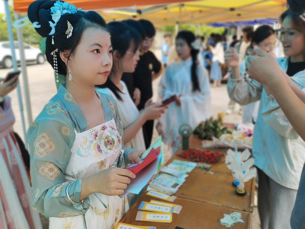 美术协会同学们深入探索端午节的文化内涵,充分利用自身的专业知识和创意,以端午节的传统习俗和元素为灵感,手绘创作出了一系列丰富多彩的美术作品,并制作成精美的钥匙扣和明信片赠送给前来参与活动的同学们。