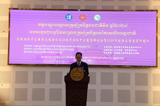 在国际中文教育志愿者项目20周年国际中文教育研讨会暨2024年赴柬志愿者岗中培训的开幕式上,王殿元向为中柬教育文化交流与合作作出重要贡献的志愿者们表示感谢,并勉励他们通过不断的学习和实践,为成为一名更加优秀的国际中文教育志愿者奠定坚实的基础。