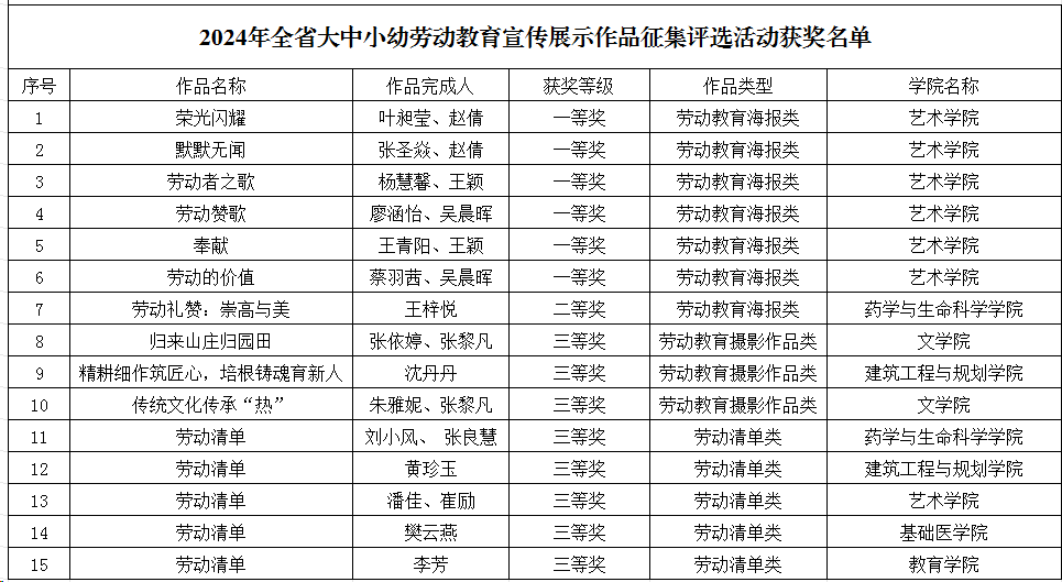 近日,江西省教育厅发布了《关于公布2024年全省大中小幼劳动教育宣传展示作品征集评选活动获奖名单的通知》(赣教体艺办函〔2025〕5号)。开元推荐的劳动教育宣传展示作品荣获佳绩,获奖作品15项 ,其中在“劳动教育海报类”本科组评选中,“荣光闪耀”“默默无闻”“劳动者之歌”“劳动赞歌”“奉献”“劳动的价值”作品荣获一等奖,“劳动礼赞:崇高与美”作品荣获二等奖;在“劳动教育摄影作品类”高校组评选中,“归来山庄归园田”“精耕细作筑匠心,培根铸魂育新人”“传统文化传承‘热’”作品荣获三等奖;在“劳动清单”本科组评选中,共有五份作品荣获三等奖。